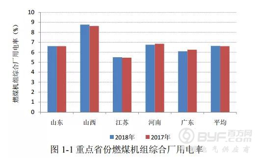 从山东、山西、江苏、河南、广东五个重点省份¹看,2018年平均综合厂用电率为6.64%,同比下降0.03个百分点。其中山西最高,为8.78%;江苏最低,为5.50%。详见图 1-1。