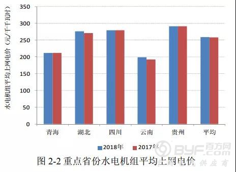从青海、湖北、四川、云南、贵州五个重点省份看,2018年平均上网电价为258.58元/千千瓦时,同比增长0.41%。其中贵州最高,为291.64元/千千瓦时;云南最低,为198.71元/千千瓦时。详见图 2-2。