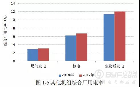 从全国看,2018 年燃气发电、核电、生物质发电平均综合厂用电率分别为2.87%、6.19%、11.40%,同比分别下降0.20个百分点、0.51个百分点、0.65个百分点。详见图1-5。