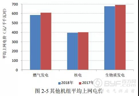 从全国看,2018年燃气发电、核电、生物质发电平均上网电价分别为584.10元/千千瓦时、395.02元/千千瓦时、677.99元/千千瓦时 , 同比分别下降3.81%、 1.58%、2.00%。详见图 2-5。