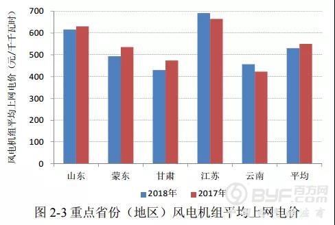 从全国看,2018年风电机组平均上网电价为529.01元/千千瓦时,同比下降3.43%。其中上海最高,为746.47元/千千瓦时;蒙西最低,为391.40元/千千瓦时。详见附件 2- 2。