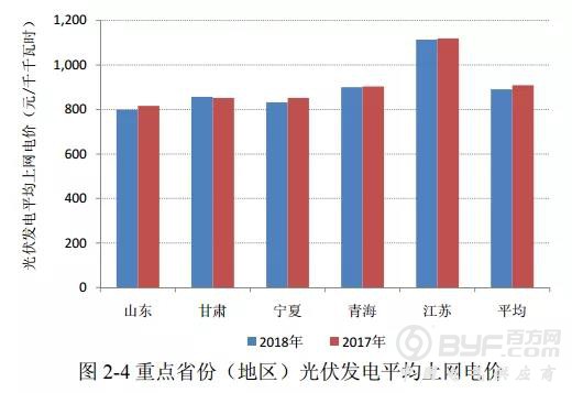 从全国看,2018年光伏发电平均上网电价为859.79元/千千瓦时,同比下降1.71%。其中上海最高,为1,198 元/千千瓦时;重庆最低,为396.40元/千千瓦时。详见附件 2-2。