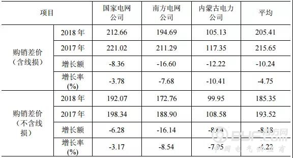2018 年,电网企业平均购销差价(含线损)为205.41元/千千瓦时,同比减少4.75%;扣除线损,电网企业平均购销差价为185.35元/千千瓦时,同比减少4.22%。