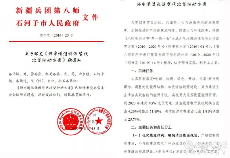 2019年8月,新疆石河子市出台清洁能源替代攻坚行动方案。提出到2020年底建成7GW光伏发电,清洁能源电力装机规模占比由4.26%调整至51.89%,清洁能源发电量占比由1.81%调整至25.74%;并明确了送出方案。