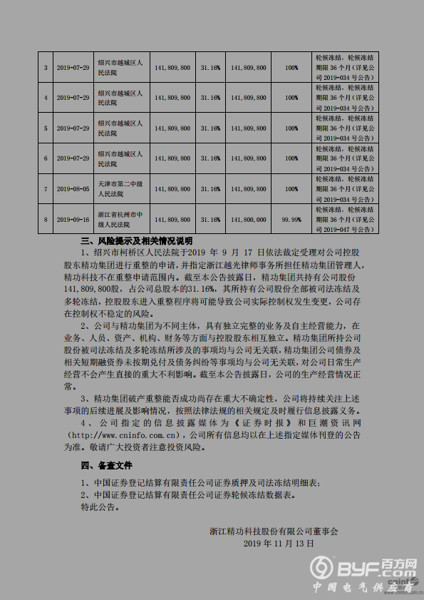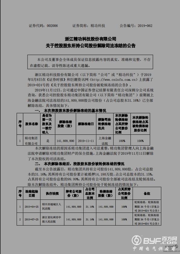 近日,精功科技发布公告称,2019年11月12日,公司通过中国证券登记结算有限责任公司深圳分公司系统查询,获悉公司控股股东精功集团前期被上海金融法院司法冻结的1.4181亿股公司股份(占公司总股本31.16%)已全部解除冻结,原因系精功集团进入司法重整,精功集团管理人向上海金融法院申请解除对精功集团财产的保全措施。