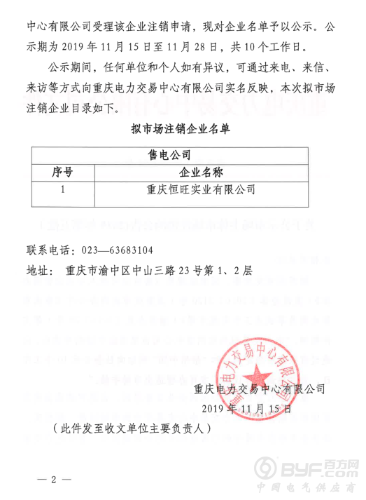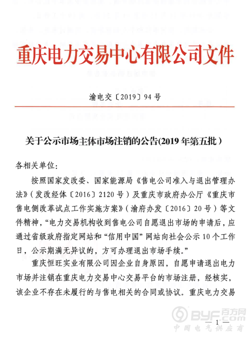 重庆电力交易中心日前发布了《关于公示市场主体市场注销的公告(2019年第五批)》,重庆恒旺实业有限公司自愿退出市场,公示期为2019年11月15日至11月28日,共10个工作日。