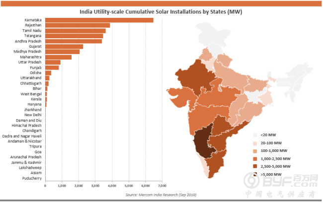 在2019年第三季度,大规模安装总计1,925兆瓦,而2019年第二季度为1,218兆瓦,2018年第三季度为1,157兆瓦。印度的大规模太阳能项目开发管道已增加至22.6吉瓦。大约37.3吉瓦的太阳能已经招标,正在等待本季度末的拍卖。