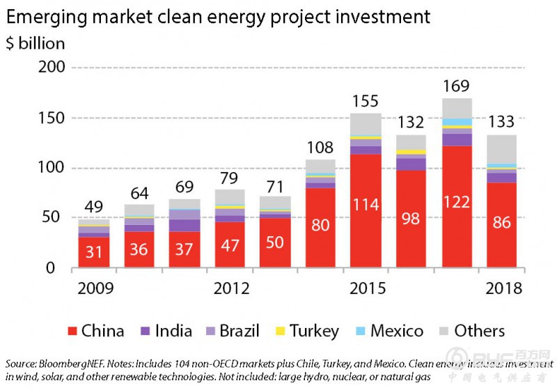 中国既是世界上最大的CO2排放国,又是清洁能源生产和消费的最大市场,在这个过程中起着至关重要的作用。中国对新风能,太阳能及其他非大型水可再生能源项目的投资从2017年的1220亿美元下降至2018年的860亿美元。这一净下降反映了新兴市场清洁能源投资数字下降了360亿美元,为有史以来由Climatescope追踪的最大年度降幅。