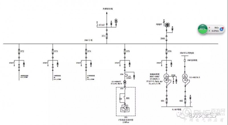 箱式变压器升压至35kV,经35kV 高压集电线路汇集至35kV开关站,经35kV 丹碧招彩线并入电网。开关站电气主接线图如下: