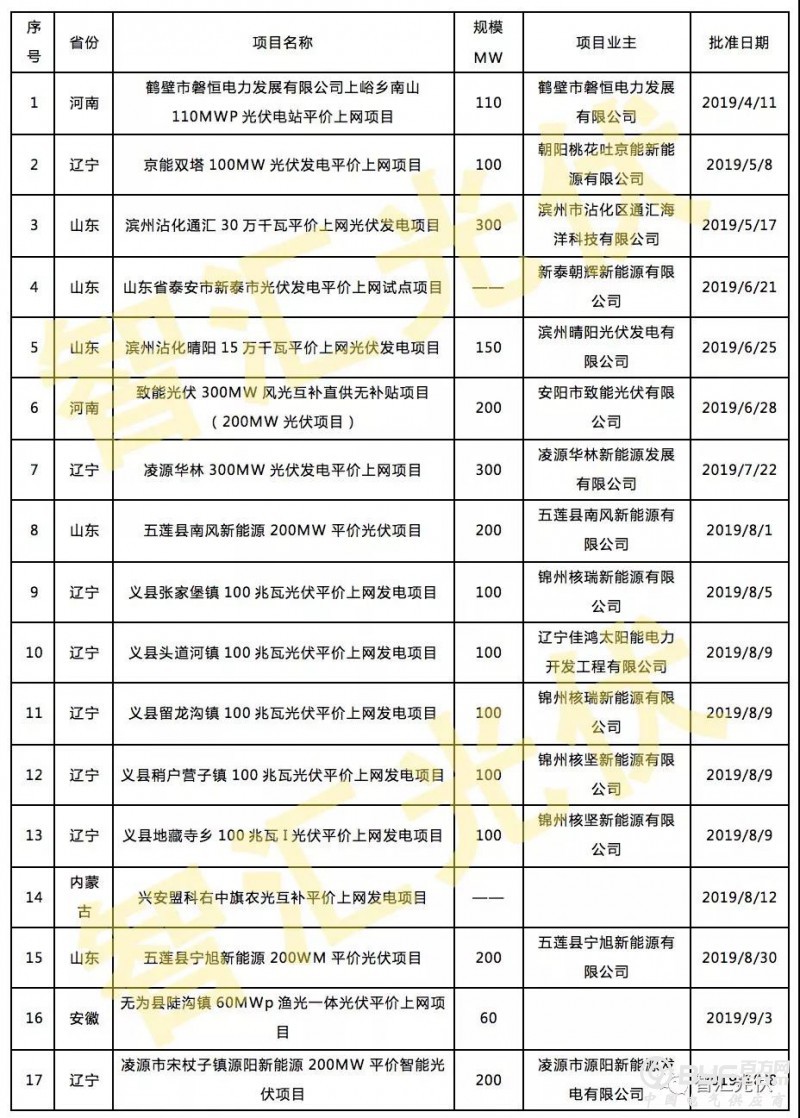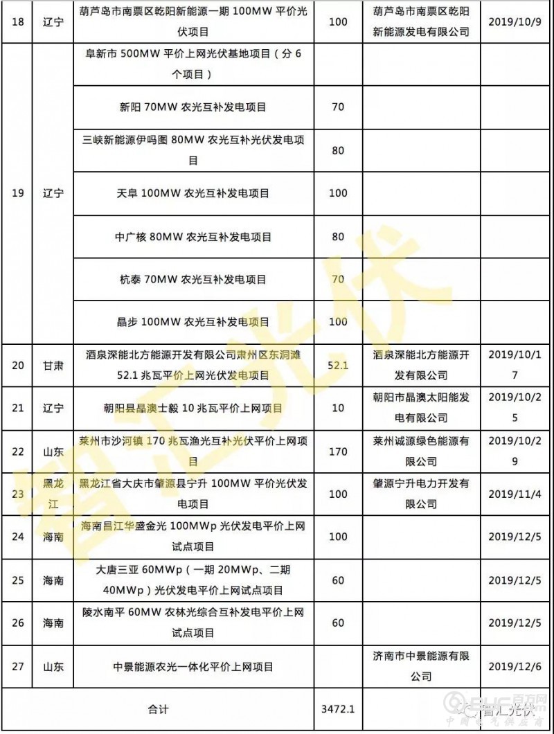 "全国投资项目在线审批监管平台"追踪的数据显示:除了第一批14.78GW平价上网光伏项目之外,目前全国已经备案的平价上网项目至少有3.5GW。具体如下表所示。