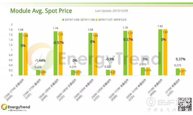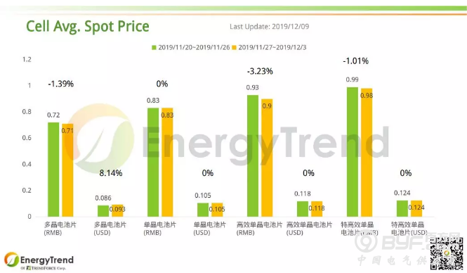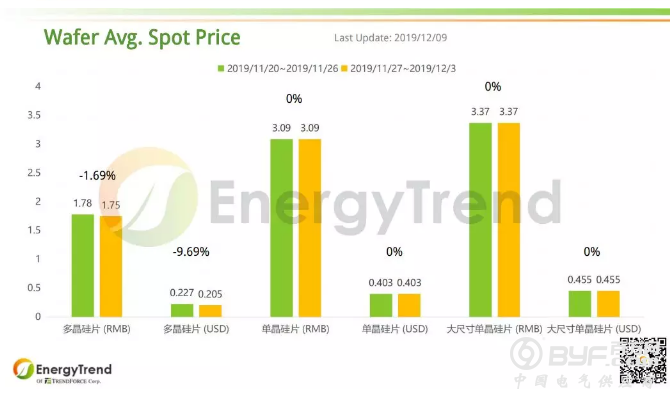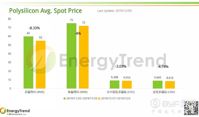 2019年12月4日的最新报价,大陆多晶用料的价格从 RMB60/KG 跌落至 RMB55/KG,跌幅为 8.33%;单晶用料价格从 RMB75/KG 下跌至 RMB72/KG,跌幅为 4%。非中国区多晶硅料从 US$9.298/KG 跌落了 3.03% 来到 US$9.016/KG;全球多晶硅料的最新均价为 US$8.616/KG,比之前的 US$9.045/KG 减少了 4.74%。