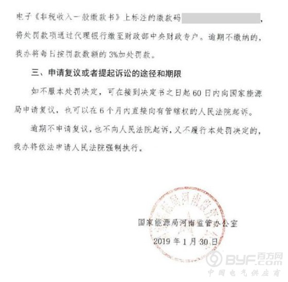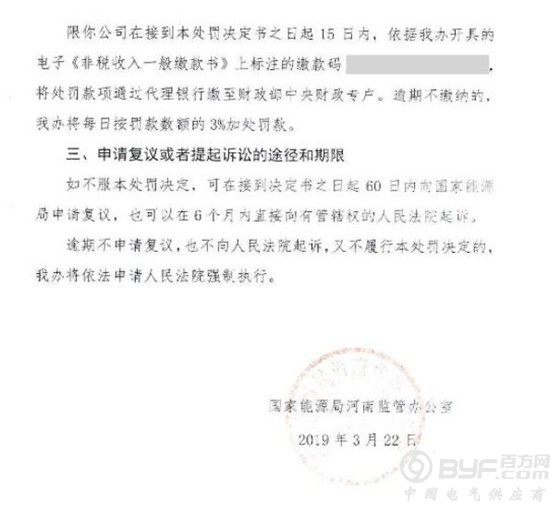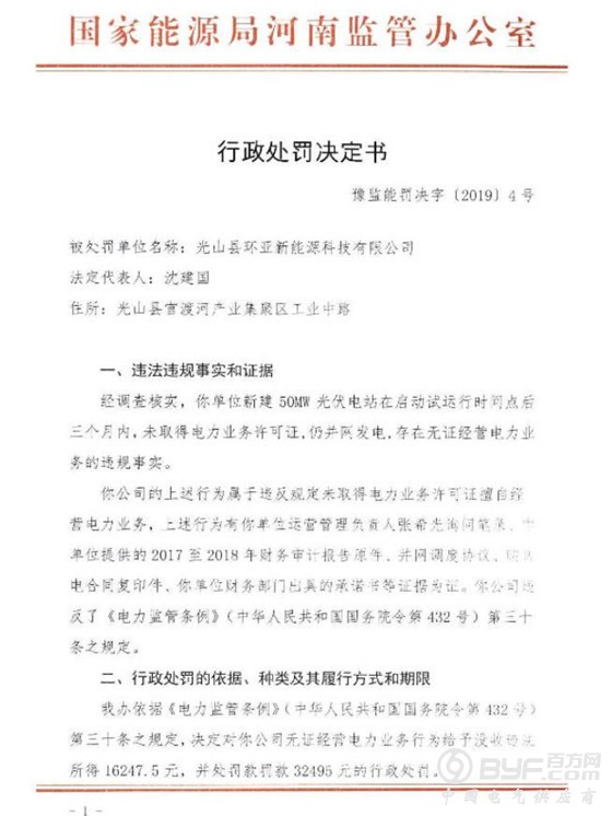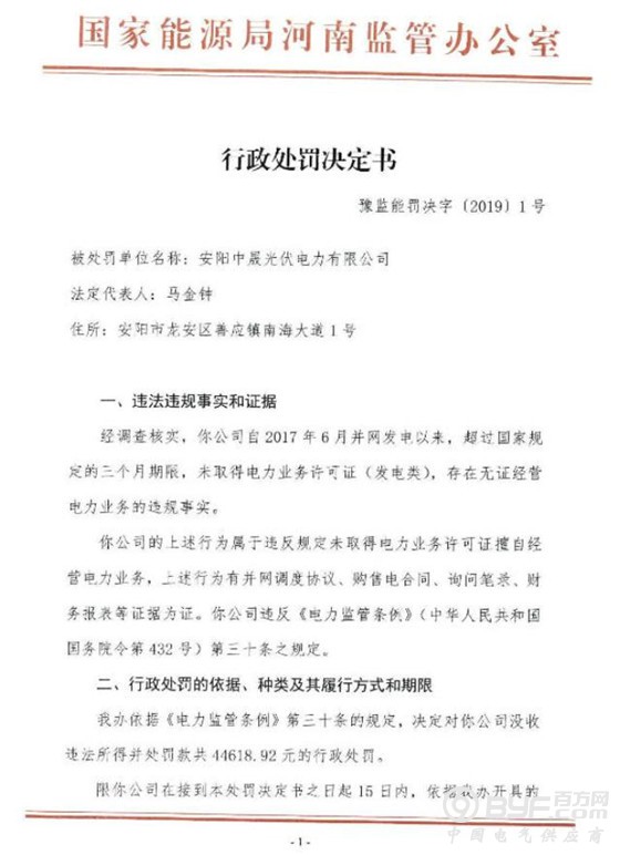 日前,国家能源局河南监管办公室发布两条《行政处罚决定书》,文件显示,经调查核实,安阳中晟光伏电力有限公司自2017年6月并网以来,超过国家规定的三个月期限,未取得电力业务许可证(发电类),存在无证经营电力业务的违规事实,河南能监办决定对该公司没收违法所得并处罚款共44618.92元的行政处罚;光山县环亚新能源科技有限公司新建50MW光伏电站在启动试运行时间点后三个月内,未取得电力业务许可证,仍并网发电,存在无证经营电力业务的违规事实,河南能监办决定对该公司无证经营电力业务行为给予没收违法所得16247.5元,并处罚款32495元的行政处罚。
