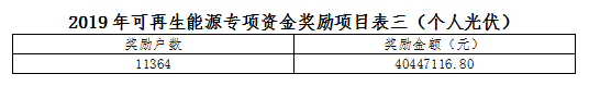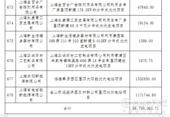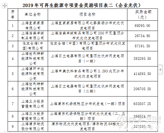 近日,上海市为促进全市可再生能源发展,公示2019年度可再生能源专项资金拨付计划(草案),据公告显示,本次公示光伏项目共计678个,奖励金额共计98,798,063.71元,此外,个人光伏奖励11364户,共计40447116.8元。