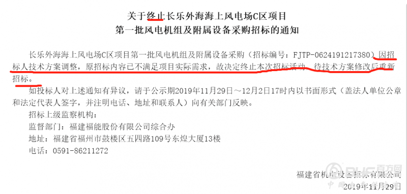 近日,长乐外海海上风电场C区项目第一批80MW风电机组及附属设备采购项目流标。公告称因招标人技术方案调整,原招标内容已不满足项目实际需求,故决定终止本次招标活动,待技术方案修改后重新招标。