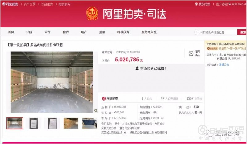 12月10日,在阿里拍卖中第一次拍卖的483箱多晶A光伏275W组件,合计总价5,020,785元,按照单价折算(5020785/483/30/275=1.26元/瓦)单价是1.26元/瓦,却出现了流拍的现象。截至12月11日的行情显示,多晶275瓦组件市场均价为1.55元/瓦,即使便宜了18.7%,但最终还是无人问津并且流拍。