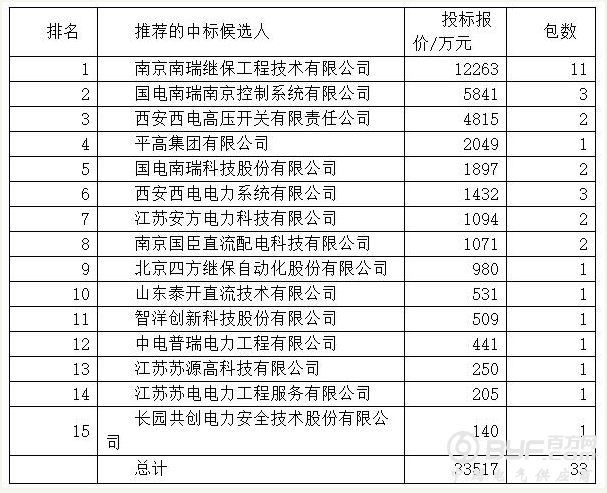 南瑞的4家企业合计中17包20442万元,占总金额的61.0%。西电的2家企业中5包6247万元,占总金额的18.6%。其它中标的大品牌有平高2049万元,四方980万元,泰开531万元。