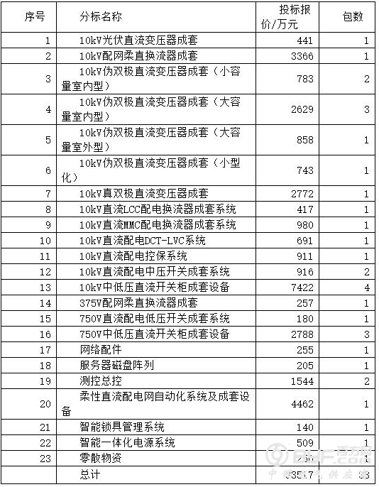 西安西电电力系统有限公司中3包1432万元第六。所中物资为:10kV伪双极直流变压器成套(小容量室内型)385万元、10kV伪双极直流变压器成套(大容量室内型)630万元、10kV直流LCC配电换流器成套系统417万元。