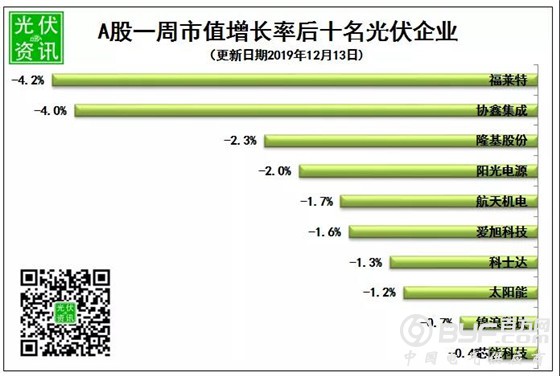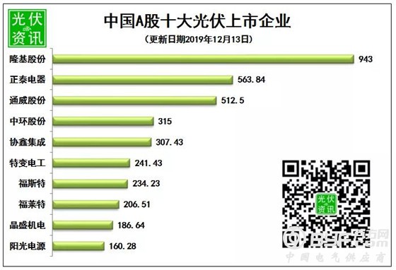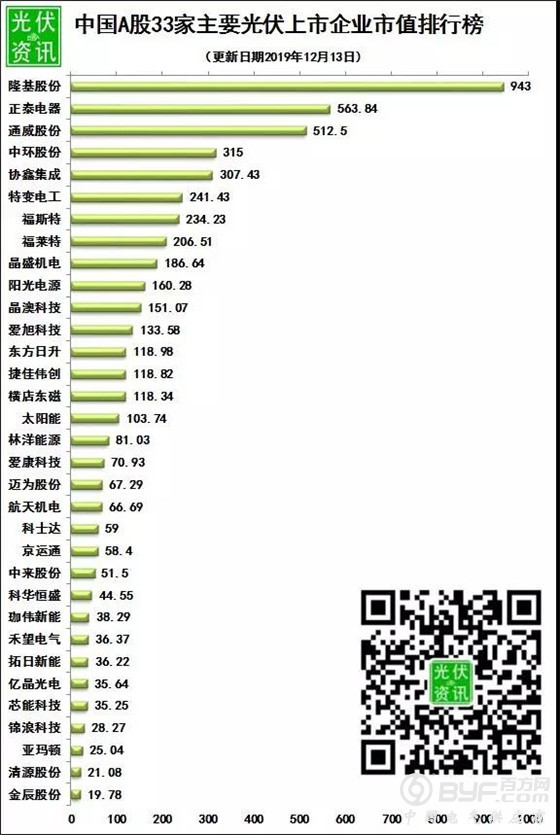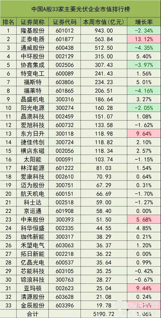 截止2019年12月13日下午收盘,33家光伏企业市值总计5190.72亿元,比上周增长54.57亿元,增加1.06%。在市值方面,隆基股份依然遥遥领先,总市值达到943亿元,金辰股份市值最低为19.78亿元。增长率方面,正泰电器本周上涨13.1%,东方日升本周上涨9.6%,居于增长前两位;本周负增长11家,最低为通威股份,增长率为-4.3%。