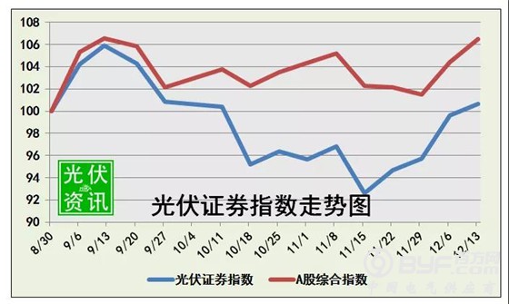 本周光伏证券指数开始抬升,达到100.65%,对A股指数对比,下降幅度较小,可以看出资本市场对光伏行业信心正在快速提升!