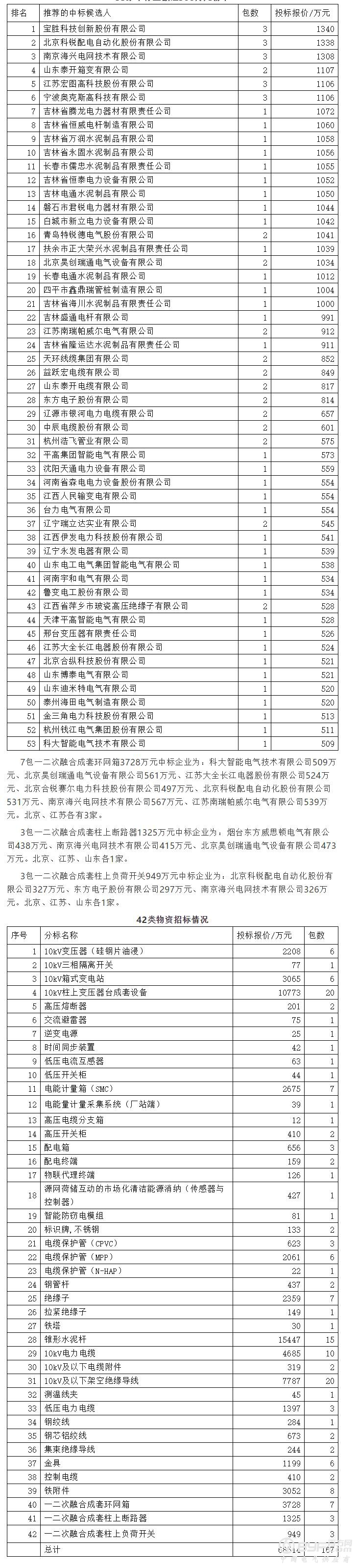 山东泰开箱变有限公司中2包1107万元第四。所中物资为:10kV箱式变电站547万元、10kV柱上变压器台成套设备560万元。