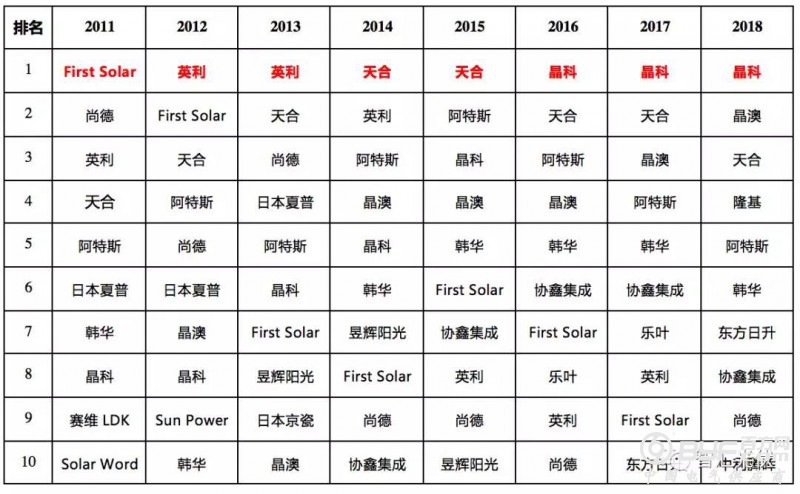 对于传统的能源行业,行业老大的地位几乎是不可撼动的,如BP、美孚,地位上百年来无可动摇。而对于光伏行业,行业老大变化很快。本文统计了最近8年(2018~2011年)光伏组件出货量前10名的企业。从排名的剧烈变化中可以看出,光伏组件制造是个竞争十分激烈的行业,前浪很容易被后浪拍在沙滩上。