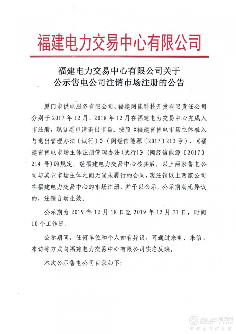 退市!福建电力交易中心公示2家售电公司注销公告