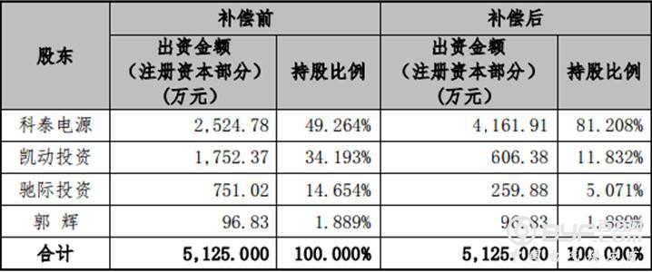 股权补偿之前,科泰电源持有精虹科技的股权比例为49.264%。凯动投资以无偿转让注册资本1145.99万元,转让的股权比例占持股比例的22.361、驰际投资转让注册资本491.14万元,转让的股权比例占持股比例的9.583%,作为2018年业绩补偿,使公司的投资额达到公司对精虹科技实际投资总额1.51亿元,持股比例为81.208%。