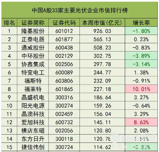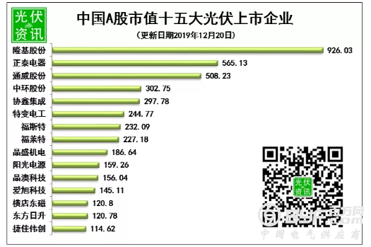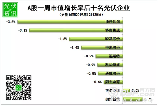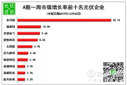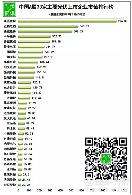 截止2019年12月20日下午收盘,33家光伏企业市值总计5220亿元,比上周增长30亿元,增加0.58%。在市值方面,隆基股份依然遥遥领先,总市值达到926亿元,金辰股份市值最低为20.02亿元。增长率方面,亚玛顿本周上涨40.1%,福莱特本周上涨10%,居于增长前两位;本周负增长9家,最低为中环股份,增长率为-3.9%。