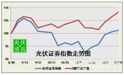 本周光伏证券指数开始抬升,达到101.23%,对A股指数对比,下降幅度较小,可以看出资本市场对光伏行业信心正在快速提升!