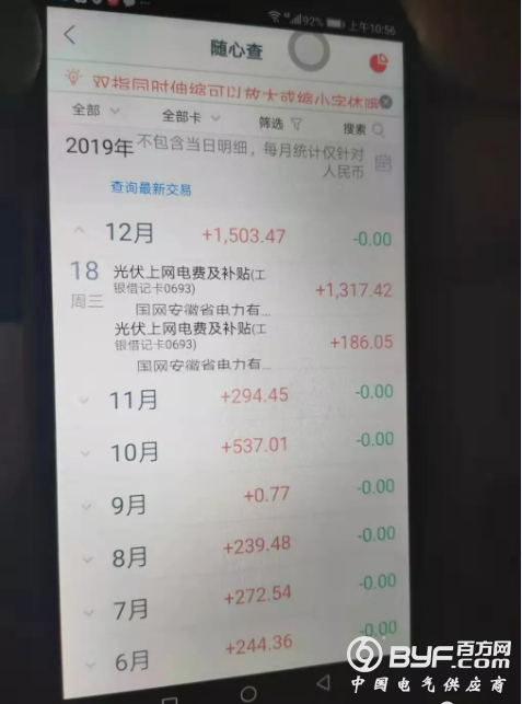 12月18日,国网安徽省电力公司给老徐的客户下发了名为“光伏上网电费及补贴”,分别两笔为1317元和186元,而前几个月入账仅有200多元的电费入账,补贴今年一直未见,此次下发补贴,把今年拖欠的金额都清算了。该打款截图真实反馈了拖欠的户用光伏补贴正在录下下发,如果还有未拿到补贴的业主,也不用太过着急,应该也快到账了。