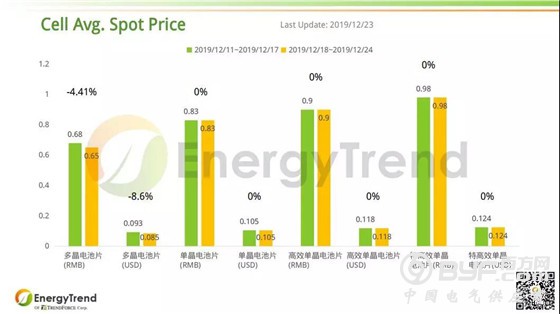 根据2019年12月18日的最新报价,大陆多晶用料的价格从 RMB54/KG 跌落至 RMB52/KG,跌幅为 3.7%;单晶用料价格维持在 RMB72/KG。非中国区多晶硅料从 US$8.801/KG 跌落了 0.03% 来到 US$8.798/KG;全球多晶硅料的最新均价为 US$8.523/KG,比之前的 US$8.537/KG 减少了 0.16%。
