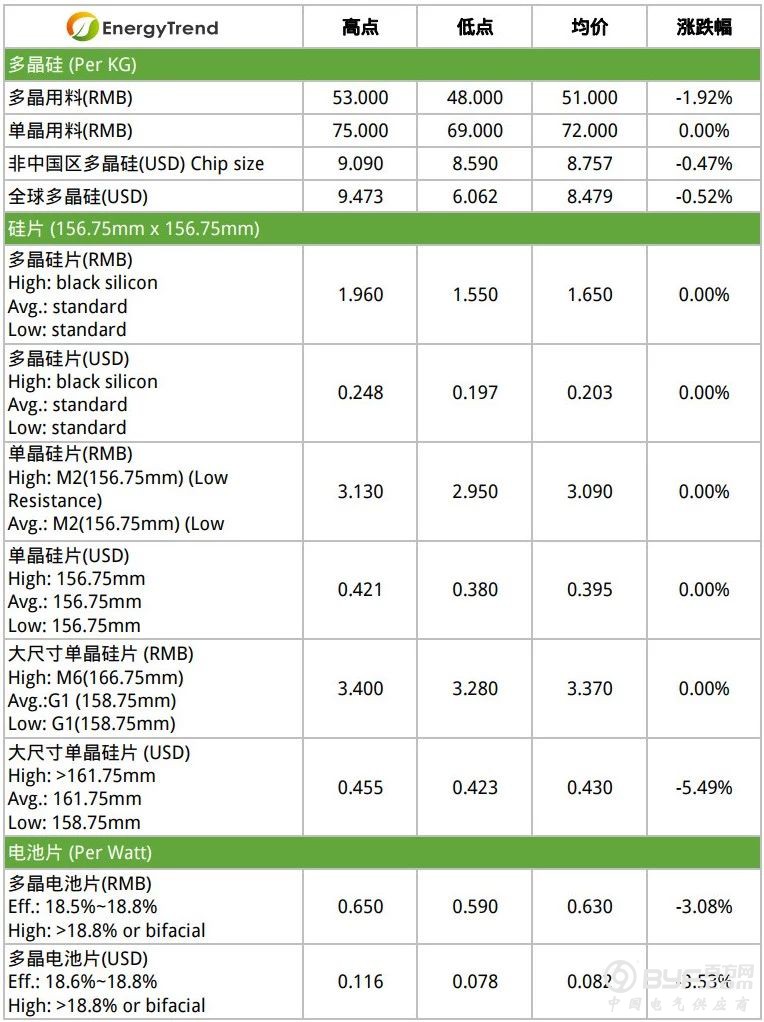 本周电池片市场价格主要是以热门产品变动较多,中间价格的产品则没有变化,单晶需求仍然是高于多晶,多晶价格依然是续跌不止。目前海外一般多晶电池片维持不变在0.078~0.116USD/W,均价下调至0.082USD/W,一般单晶电池片维持不变在0.102~0.107USD/W,高效单晶电池片维持不变在0.112~0.133USD/W,特高效单晶电池(>21.7%)修正区间至0.116~0.165USD/W,均价维持不变在0.124USD/W。