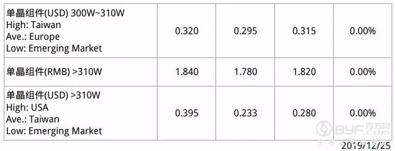 本周组件市场价格维持稳定不动的局面,接近年底尾声,该交付完工的项目也即将完成并往结案,对于农历年前的备货需求仍属于观望的态度。目前海外270W~275W产品维持不变在0.196~0.205USD/W,280W~285W产品维持不变在0.205~0.225USD/W,290W~295W产品修正区间至0.202~0.225USD/W,均价维持不变在0.219USD/W,300W~310W产品维持不变在0.295~0.320USD/W,>310W产品维持不变在0.233~0.395USD/W。