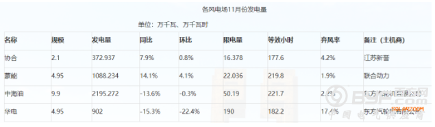 二、全市风电场11月份发电量