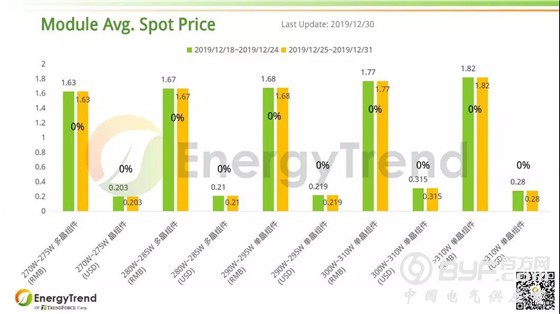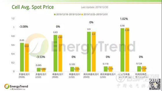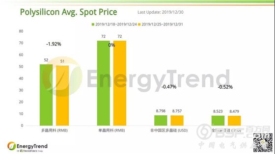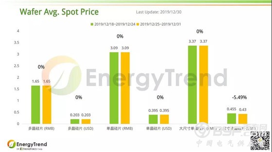 2019年12月25日的最新报价,大陆多晶用料的价格从 RMB52/KG 跌落至 RMB51/KG,跌幅为 1.92%;单晶用料价格维持在 RMB72/KG。非中国区多晶硅料从 US$8.798/KG 跌落了 0.47% 来到 US$8.757/KG;全球多晶硅料的最新均价为 US$8.479/KG,比之前的 US$8.523/KG 减少了 0.52%。本周硅片产品价格相对稳定。多晶硅片的人民币报价依旧为 RMB1.65/Pc;美金报价为 US$0.203/Pc。单晶硅片人民币报价为 RMB3.09/Pc;美金价格为 US$0.395/Pc。最新大尺寸单晶硅片的人民币报价为 RMB3.37/Pc,产品美金报价从 US$0.455/Pc 下滑至 US$0.43/Pc,跌幅为 -5.49%。