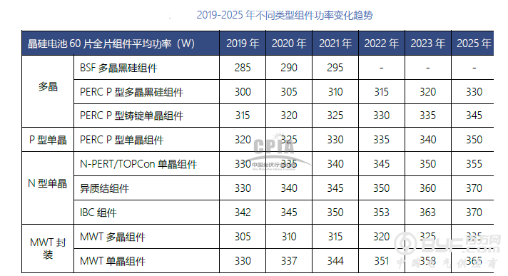 2019年,单晶电池组件普遍采用PERC技术,功率达到 320W,较 2018 年提高15W;常规多晶黑硅组件主要功率约为 285W;PERT/TOPCon 电池组件、异质结电池组件功率可达到 330W。未来几年,随着技术的进步,各种类型电池组件基本上以≥5W/年的增速向前推进。