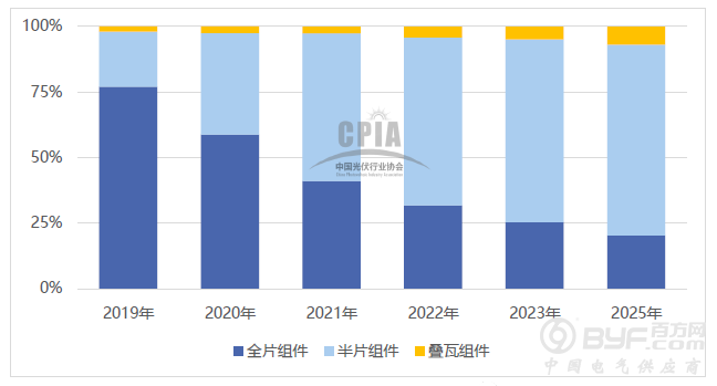 2019年,全片组件仍占据主要市场份额,市场占比约为77.1%,较2018年下降了14.6个百分点。由于半片或更小片电池片的组件封装方式可提升组件功率,并且目前生产工艺已趋近成熟,未来将会取代全片封装方式占据主导份额。叠瓦受限于技术成熟度,长期可靠性也待验证,因此增长趋缓。