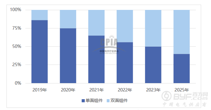 2019年,单面组件仍是市场主流,市场占比为86%。随着下游应用端对于双面组件发电增益的认可,以及安装方式的逐步优化,双面发电组件的应用规模将会不断扩大。