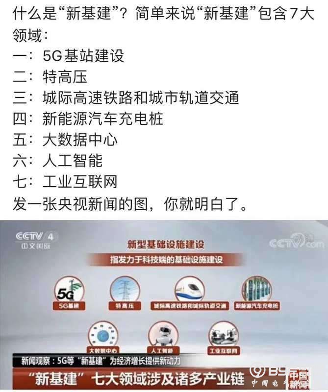“新基建”指发力于科技端的基础设施建设,主要包括七大领域:5G基站、特高压、城际高速铁路和城际轨道交通、新能源汽车充电桩、大数据中心、人工智能和工业互联网。