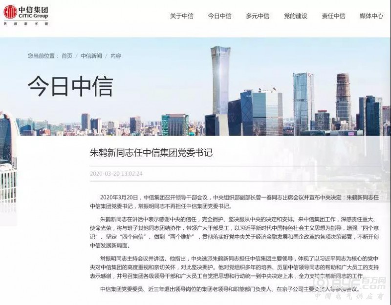 据中信集团官网,中信集团今日召开领导干部会议,中央组织部副部长曾一春同志出席会议并宣布中央决定:朱鹤新同志任中信集团党委书记,常振明同志不再担任中信集团党委书记。此外,朱鹤新还被推荐为董事长候选人。