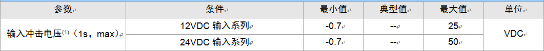 在电源模块数据手册中给出了产品的输入电压范围,如图4表示ZY_WRFCS-3W系列模块的输入冲击电压。当瞬间输入电压高过最大值,模块内部的场效应管和二极管耐压超过额定耐压,可能烧毁。