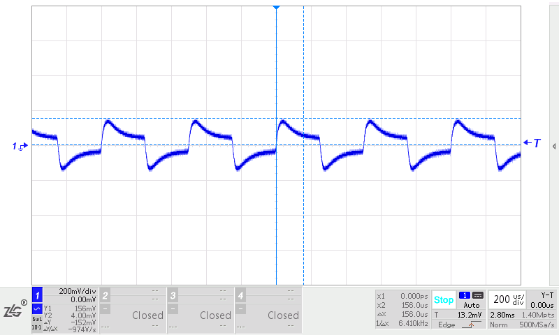 如图7所示,E2405UHBD-20W模块负载电流50%到75%负载周期性突变时的输出电压波形,这个已经不是纹波噪声。由产品数据手册知,这个参数为瞬态响应。