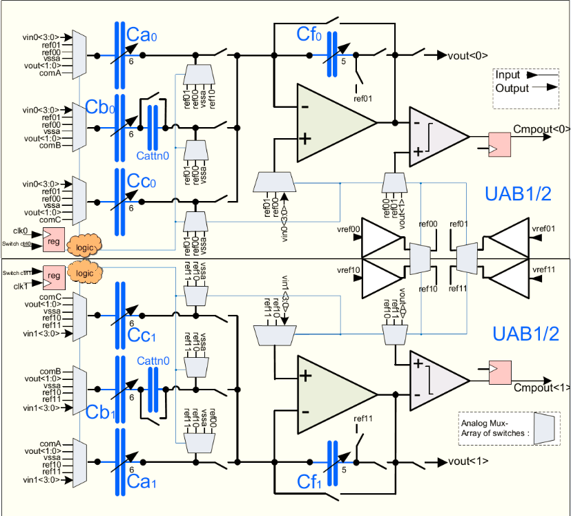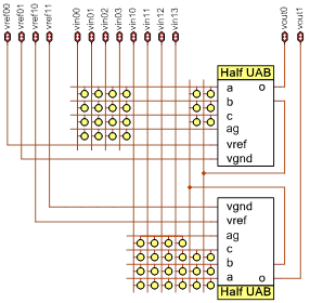 UAB由两个完全对称的半电路构成,可配置为一个伪差分或两个单端功能。 每个半电路配有用于自主操作的控制逻辑。 图2显示了简化的UAB图。 UAB具有高度灵活的转换和连续路由架构,可以实现模拟滤波器等复杂的模拟功能。
