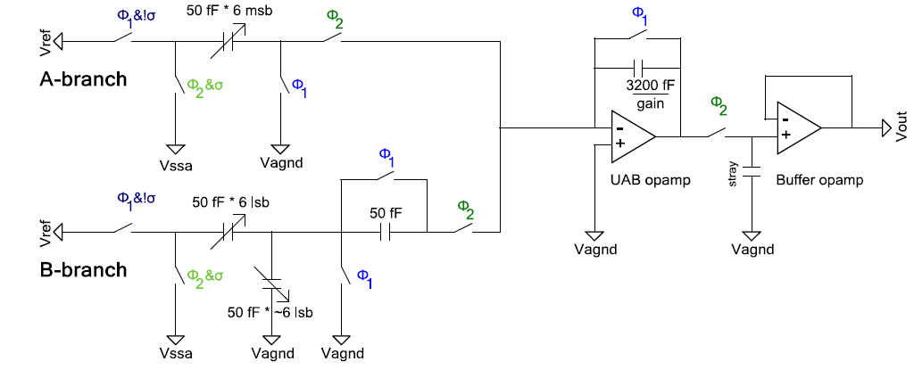 VDAC电路的UAB开关电容拓扑如图3所示。由于开关电容模块的离散时间属性,开关电容会对数据进行采样和缓冲以获得连续输出。 该模块支持在MCU的工作和睡眠模式下工作。