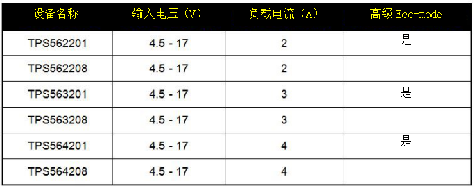 TPS56x201系列器件(参见表1)除了具有很低的外部组件数量,非常好的效率和非常快的负载瞬态响应外,还易于用于板上需要直流/直流降压转换器的不同插座。这种灵活性是由于所有器件之间的引脚到引脚兼容,以及即使负载电流要求变化到4A,也能以最小的变化轻松地切换电路板上的器件。TPS56x201系列还提供非常好的轻负载效率和先进的Eco-mode™功能,支持待机模式下的功耗调节。如果不需要这一点,并且希望在轻负载下以恒定的开关频率运行,TPS56x208系列也能够满足这种需要。参见下表1。