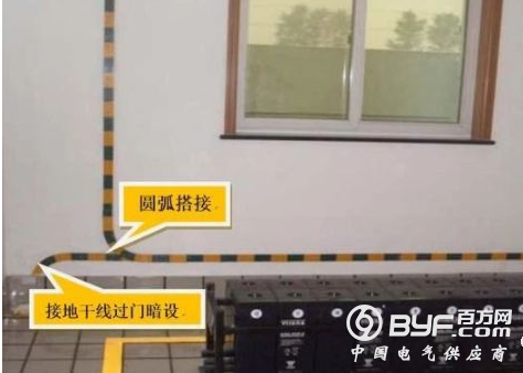 3、配电间隔和静止补偿装置的栅栏门及变电室金属门铰链处的接地连接,采用编织铜线。变配电室的避雷器须用最短的接地线与接地干线连接。接地干线穿过门框时,需要从地板里面暗敷穿过去,不得明敷裸露于地表面上。