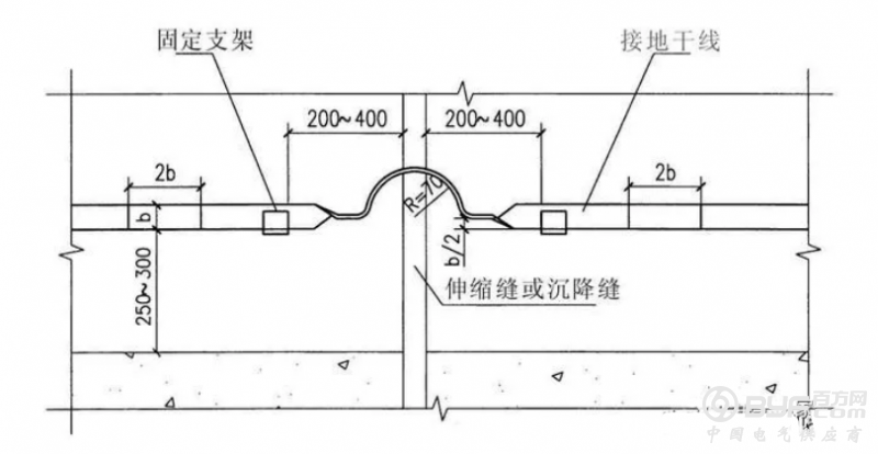 1、变压器室、高低压开关室内的接地干线有不少于2处与接地装置引出干线连接。变压器室、高压配电室的接地干线上设置不少于2个供临时接地用的接线柱或接地螺栓。当接地线跨越建筑物变形缝时,需设置补偿装置。