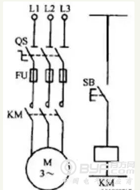 按下SB,KM线圈得电,KM触点闭合,电机转动;松开SB, KM线圈失电,KM触点断开,电机停转。