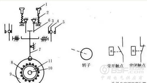 其转子的轴与被控电动机的轴相连接,定子空套在转子外围。当电动机运行时,速度继电器的转子随电动机轴转动,永久磁铁形成旋转磁场,定子中的笼型导条切割磁场而产生感应电动势,形成感应电流、其在磁场作用下产生电磁转矩,使定子随转子旋转方向转动,但由于有返回杠杆挡住,故定子只能随转子转动方向转动一定角度,当定子偏转到一定角度时,在杠杆7的作用下使常闭触头打开,常开触头闭合。