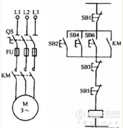 按下SB2、SB4、SB6中的任何一个按钮,KM线圈就得电,KM就吸合并自保,电机运行;按下SB1、SB3、SB5中的任何一个按钮,KM线圈就失电,KM就断开,电机就慢慢停转。